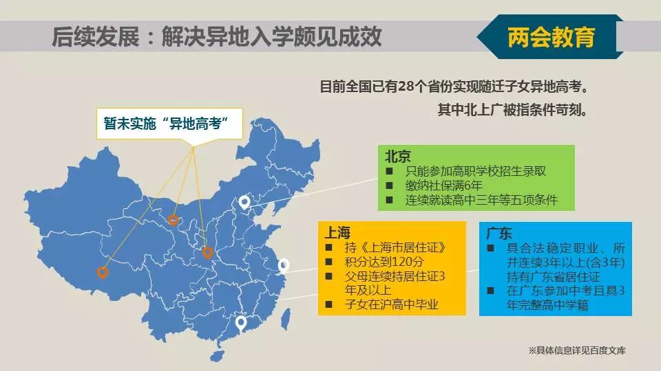 随着外来务工人员子女异地入学问题受到越来越多的关注,近年全国已有28个省份逐步实现随迁子女异地高考问题。但北上广的苛刻条件,离进一步开放还长途漫漫,家长在互联网找捷径。