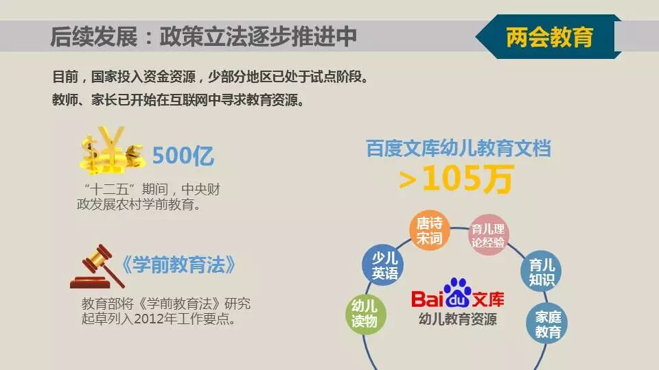 国家义务学前教育试点下放,《学前教育法》被列入教育部工作要点。全国范围内将学前教育纳入义务教育之前,互联网成为学前教育的敲门砖。