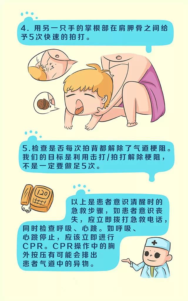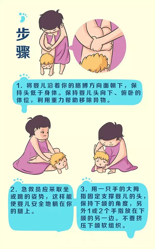 大人坐在椅子上,宝宝俯卧在双腿上,上胸部和头部低垂着,家长用一手固定孩子,另一手有节奏地拍击其两肩胛间的背部,使气道内的阻塞物脱离原位而咳出。必要的时候要进行人工呼吸或心外按摩。