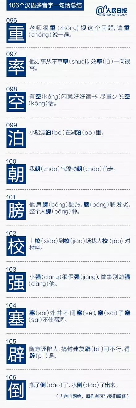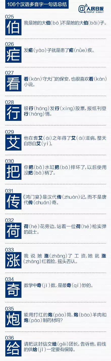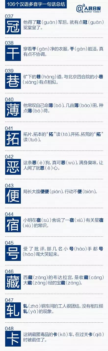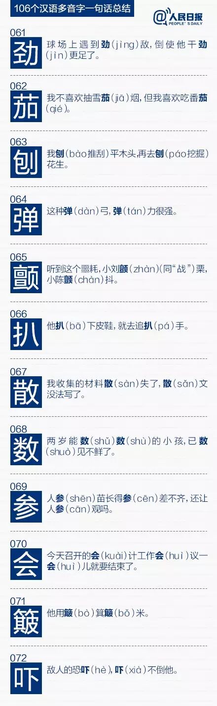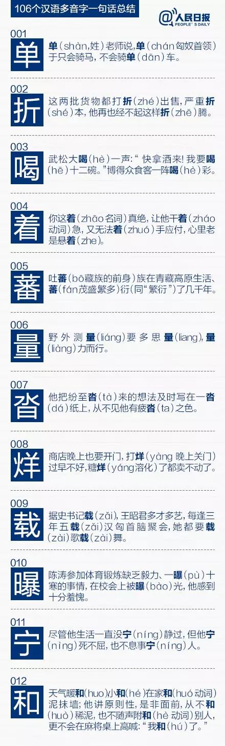 ①单:单shàn老师说,单chán于会骑马,不会骑单dān车。②数:两岁能数shǔ数shù的小孩,已数shuò见不鲜了;③着:这着zhāo真绝,让他干着zháo急,又无法着zhuó手应付,心老悬着zhe……106个多音字,一句话就总结!别再念错了!