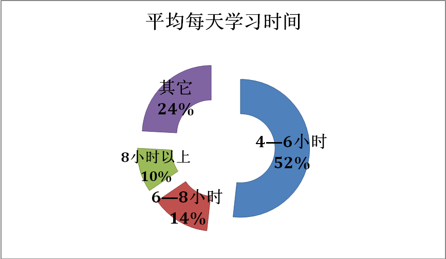 平均每天学习时间(除上课外)4—6小时的占比超过半数,达到了51.72%;6—8小时和8小时以上的分别为13.79%和10.34%。(图片四舍五入)