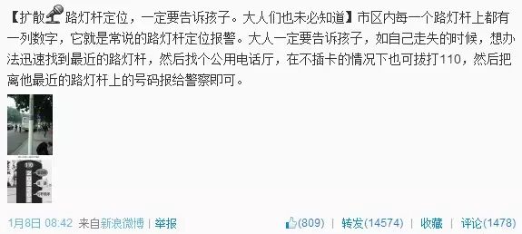 近日一条微博在网上传开:市区内每一个路灯杆上都有一列数字,它就是常说的路灯杆定位报警。大人一定要告诉孩子,如果走失,想办法迅速找到最近的路灯杆,然后找个公用电话亭,在不插卡的情况下也可拔打110,然后把离他最近路灯杆上的号码报给警察即可。
